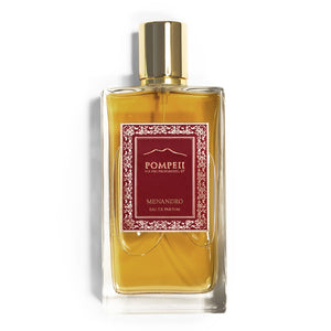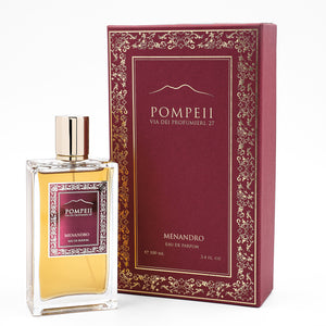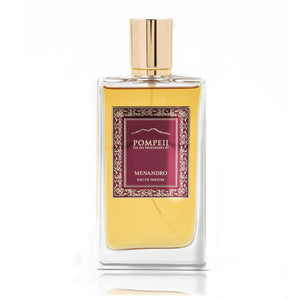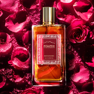 La casa “del Menandro” è una grande domus di quasi 1800 mq. Prende questo nome per il dipinto ritrovato in essa. L’ultimo proprietario è stato Quinto Poppeo certamente benestante. Questi era solito organizzare feste e pasti Luculliani nella sua villa. Si racconta che facesse cadere dall’alto petali di rose durante i suoi banchetti. Si racconta anche che Quinto Poppeo invitasse gli ospiti a provare i suoi preziosi unguenti ovvero estratti di rose prodotti dagli antichi profumieri. Abbiamo dedicato questa nuova essenza a quel luogo. Con i suoi tanti motivi olfattivi come arancio, garofano, zenzero, zafferano, cardamomo, rosa, geranio, ambra grigia, legno cedro, patchouli, sandalo legno, note animalizzate e muschio, potrà far rivivere quei momenti di sfarzo, cultura e spensieratezza…